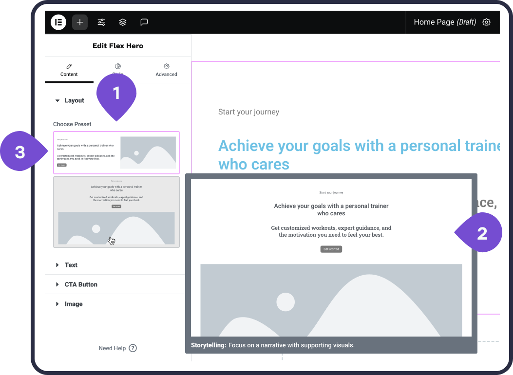 We decided to keep the more granular controls in the Style tab for advanced customization. This first version was released successfully in the Flex Hero widget, validating the function and proving the concept.